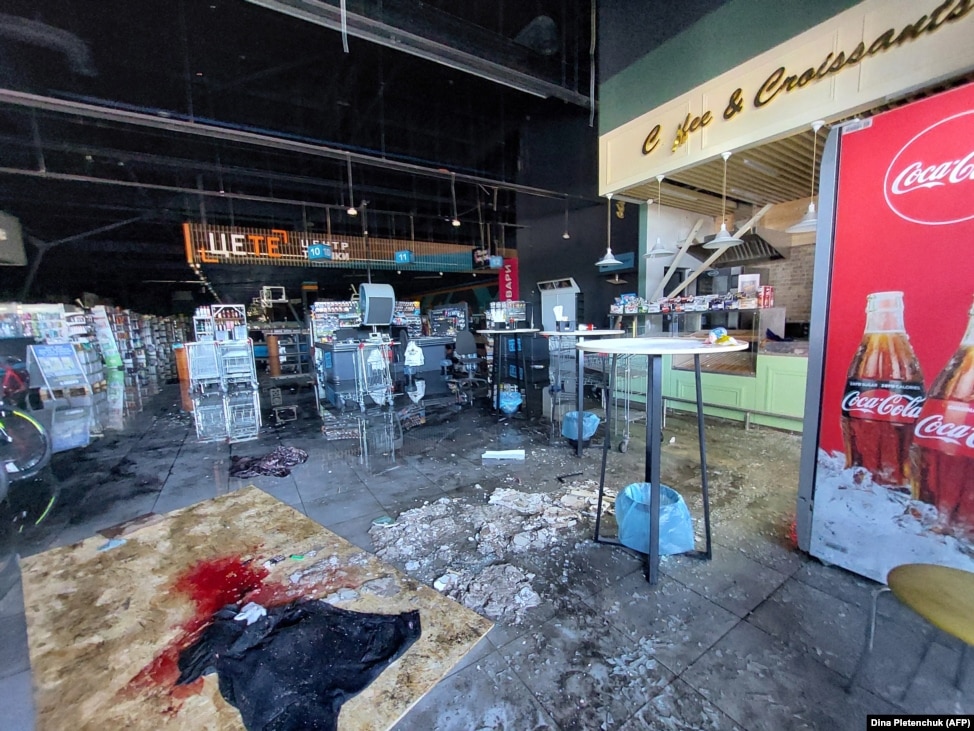 Плями крові на землі в гіпермаркеті, де від російського ракетного обстрілу загинув місцевий житель, Херсон, 3 травня 2023 року