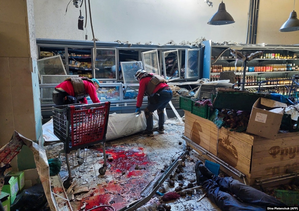 Парамедики забирають тіла місцевих жителів, які загинули в супермаркеті після російського удару в Херсоні 3 травня 2023 року