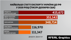Згідно із даними Держстату, вироби зі скла складають лише пів відсотка від загального обсягу експорту в Росію. У період із січня по вересень 2019 року Україна також експортувала іграшок на 10 мільйонів доларів США. Приблизно стільки ж – ефірних олій. Кожна з цих категорій товарів складає не більше, ніж 0,5% експорту України до РФ за перші три квартали 2020 року.